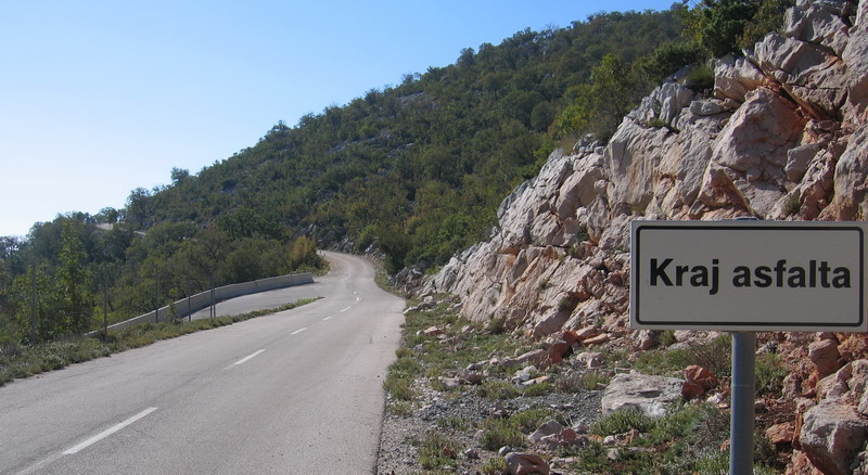 Asfalt vydržal až po stavbu tunela, ktorú sme tesne minuli. Prešli sme ponad vchod do tunela a tu nám značka oznámila "kraj asfalta" - no svojský zmysel pre humor. Nutno podotknúť, že prvú hodinku šlapania po miernych serpentínach sme stretli asi dve autá, a tento priemer neskôr ešte klesol.