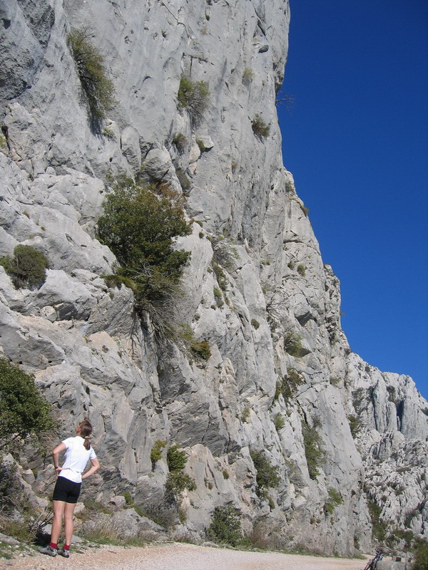 Zastali sme a zistili sme že stojíme pod malou lezeckou oblasťou s asi desiatimi cestami, ktoré sa dajú istiť priamo z auta. Na tejto štrkovej ceste nie je totož žiadny zákaz vjazdu a občas sme stretli auto s milovníkmi auto-moto turistiky.