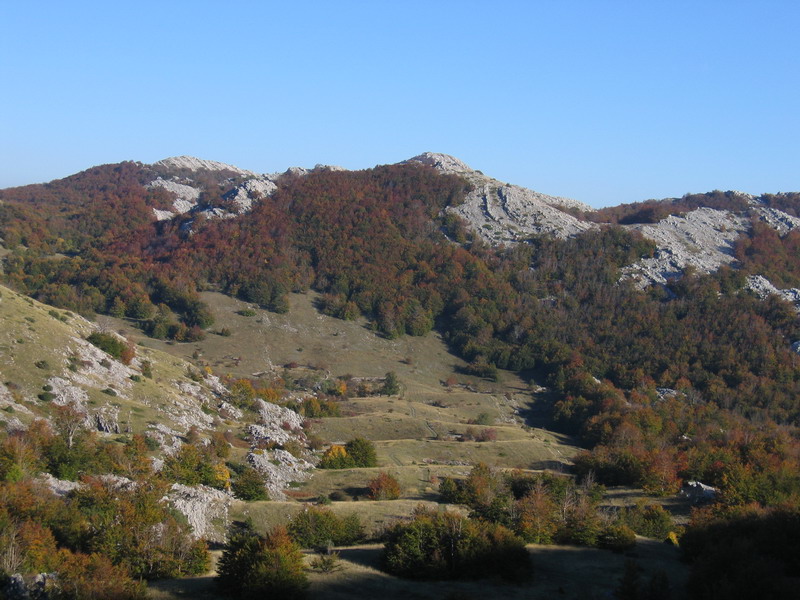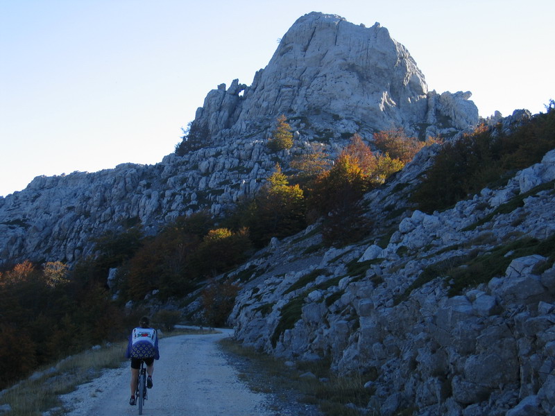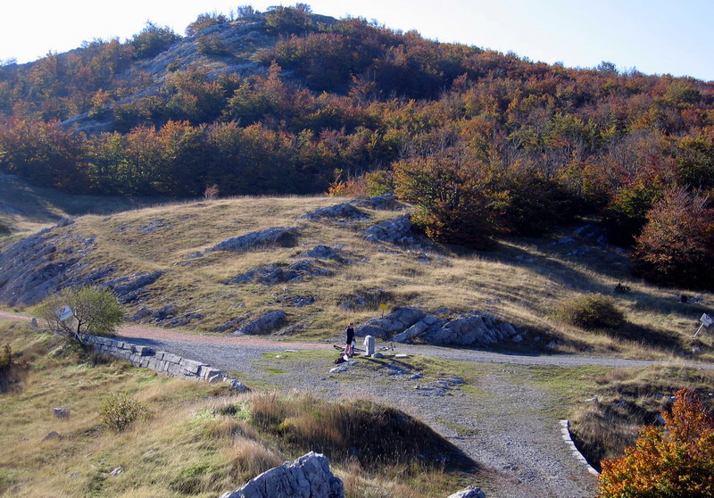Nasledoval najkrajší úsek cesty, serpentíny pomedzi vápencové bralá. Zvetralý vápenec lákal si aspoň zabouldrovať, ale s tretrami na nohách sme šlapali radšej ďalej. Cesta nás previedla pomedzi bralá na náhornú plošinu s krasovými útvarmi. Jeseň už sfarbila lístie na bukových porastoch a tak sme si vychutnávali mimoriadne výhľady.