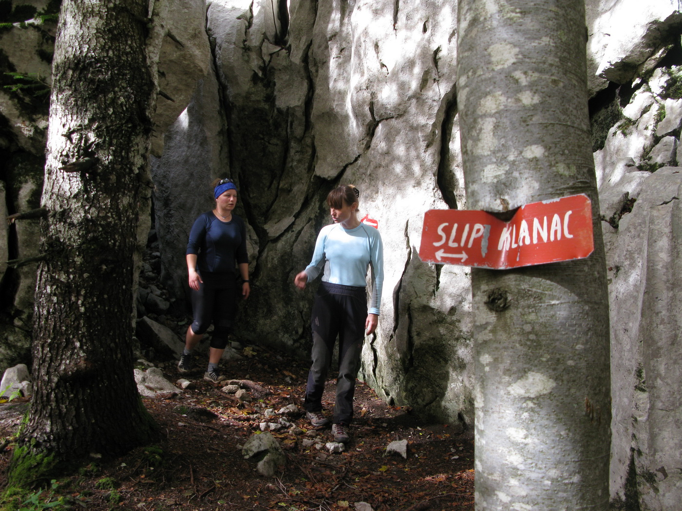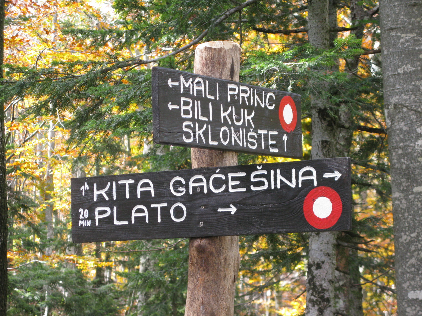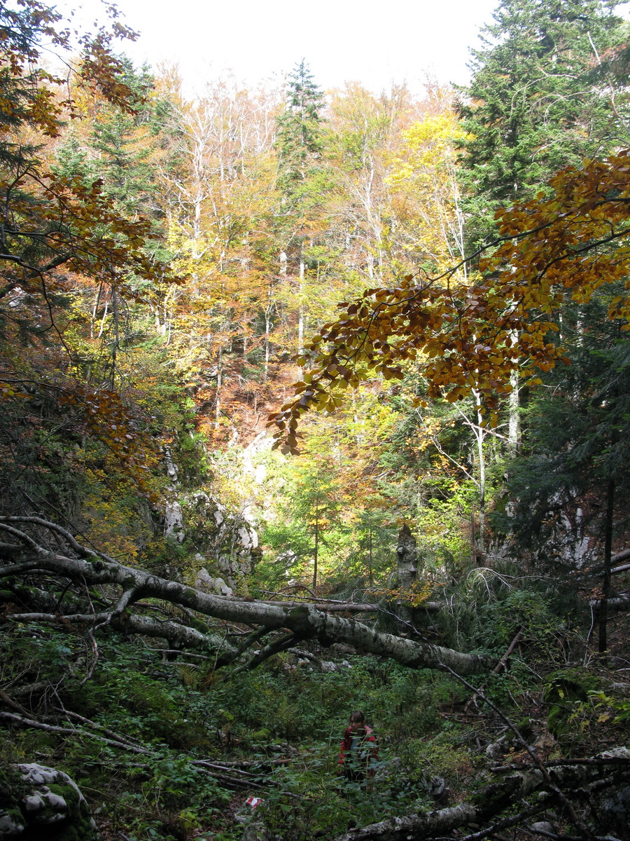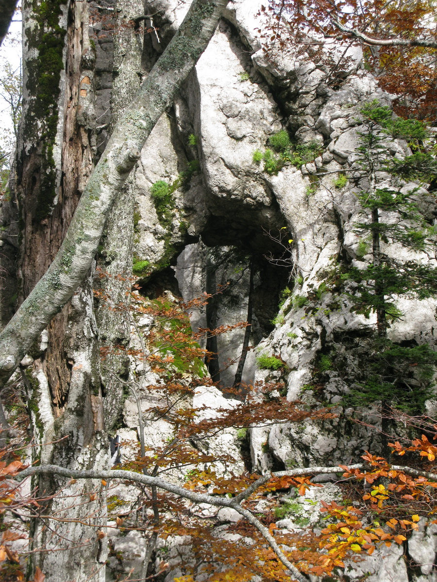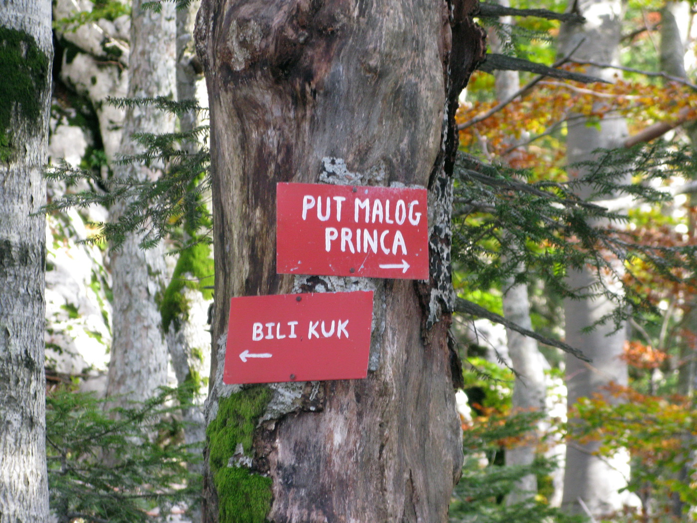 Po prestávke na chate (nikoho sme nestretli) prišlo na rad to, po čo sme sem prišli. Krátky presun bukovým pralesom, ktorý o drevorubačoch ešte nepočul, a stojíme pri rázcestníku. Put Malog princa je okruh, dal by sa ísť oboma smermi. Rozhodujeme sa ísť vpravo a okruh tak zakončiť výstupom na Bili Kuk. Zakrátko prichádzame po dobre vyznačenom chodníku k prvej "atrakcii", ako sme ich neskôr nazvali.