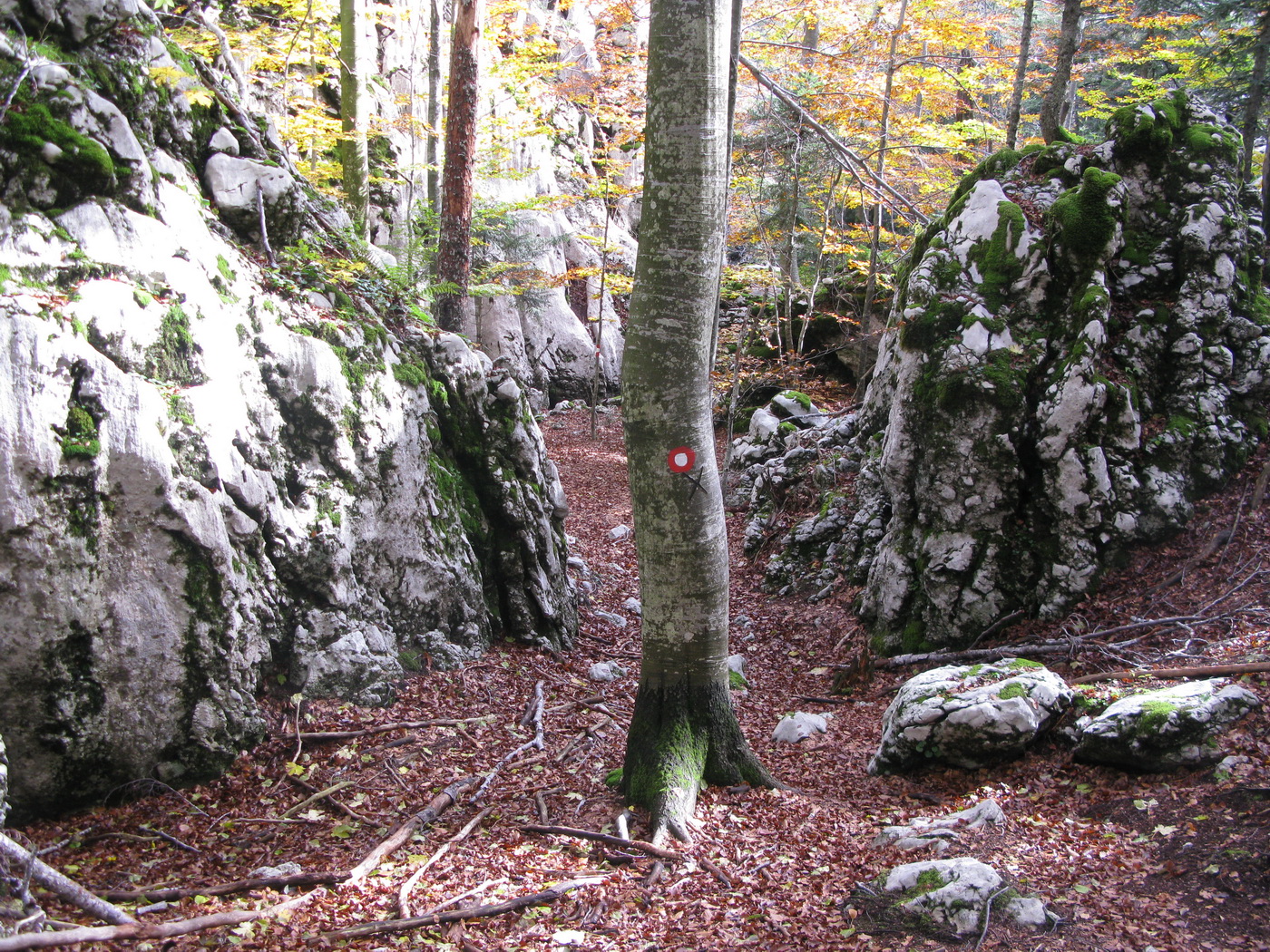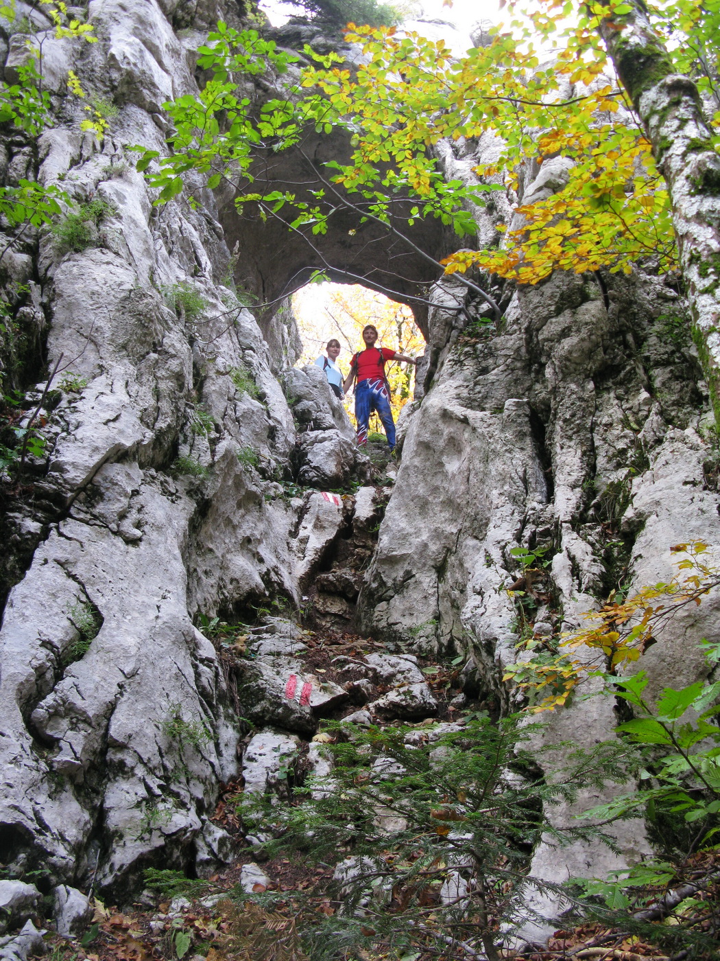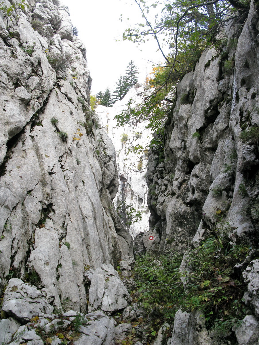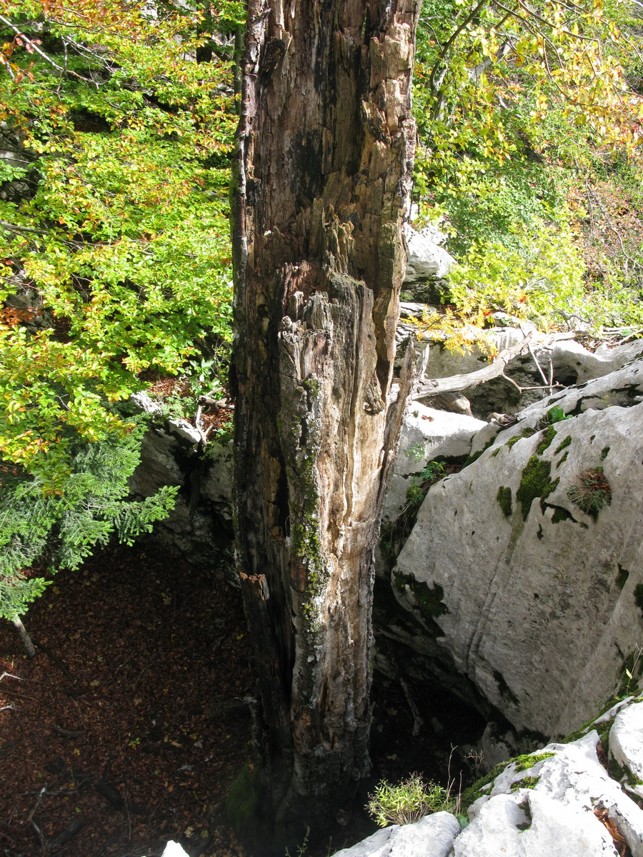 Po prestávke na chate (nikoho sme nestretli) prišlo na rad to, po čo sme sem prišli. Krátky presun bukovým pralesom, ktorý o drevorubačoch ešte nepočul, a stojíme pri rázcestníku. Put Malog princa je okruh, dal by sa ísť oboma smermi. Rozhodujeme sa ísť vpravo a okruh tak zakončiť výstupom na Bili Kuk. Zakrátko prichádzame po dobre vyznačenom chodníku k prvej "atrakcii", ako sme ich neskôr nazvali.